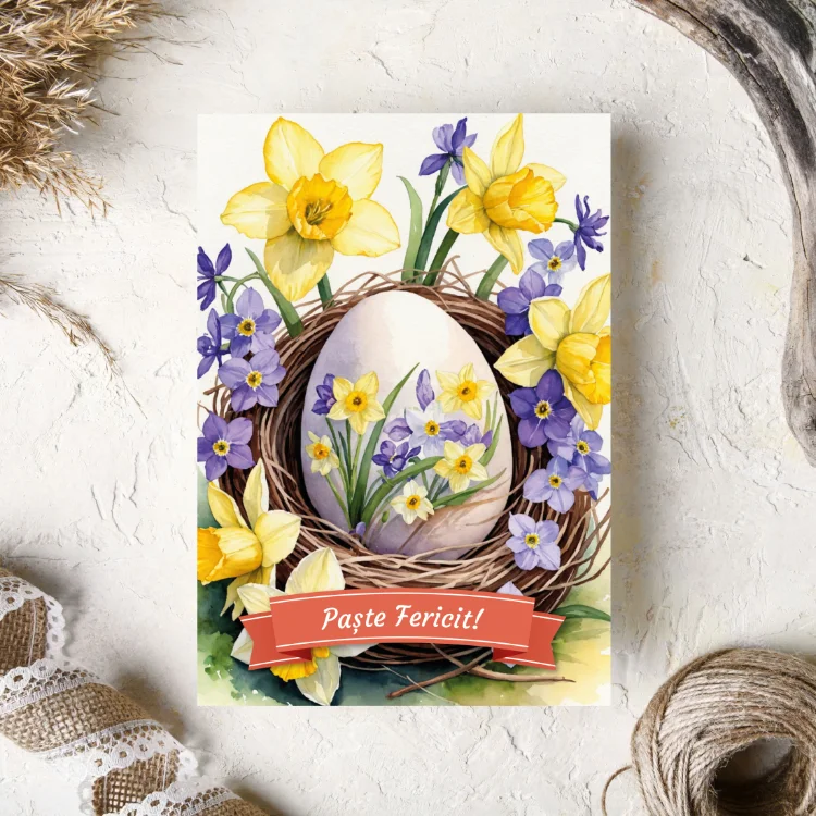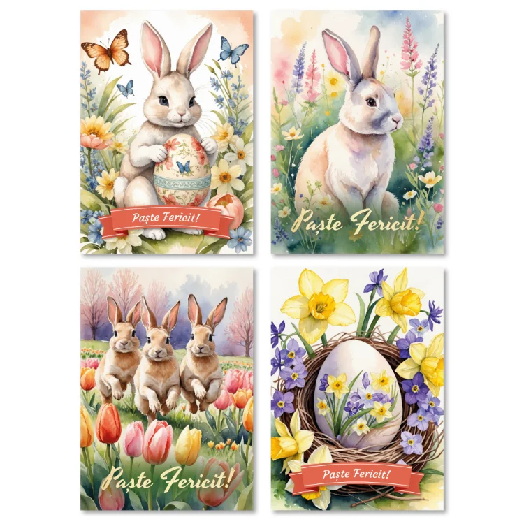 Setul de felicitari duble pentru Paste este alegerea perfecta pentru a transmite ganduri calde si urari de bine celor dragi in aceasta sarbatoare speciala. Acest set contine 4 felicitari duble, tiparite pe carton prietenos cu mediul si vin insotite de cate un plic alb fiecare. Felicitarile sunt ilustrate cu motive traditionale de Paste, de la iepurasi si oua colorate pana la flori primavaratice, toate in culori vii si armonioase. Designurile sunt potrivite atat pentru familie si prieteni, cat si pentru colegi sau parteneri de afaceri, oferind o nota de eleganta si bucurie in fiecare mesaj scris de mana. Setul include plicuri, astfel incat fiecare felicitare sa fie gata de oferit sau trimis prin posta. Indiferent cui alegi sa le daruiesti, aceste felicitari vor aduce un plus de caldura si veselie in spiritul sarbatorilor pascale.